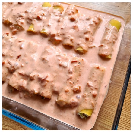 Bild 2: Die Soße auf die gefüllten Cannelloni geben.