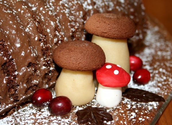 6. Unterdessen die Pilze herstellen. Jeweils aus etwas Marzipan – Rohmasse oder weißem Fondant unterschiedlich große Kegel formen. Auf die Kegel aus Marzipan jeweils einen Cioccolini Keks setzen. Für die weißen Fondantkegel dann aus rotem Fondant Kugeln formen, flach drücken und auf die Kegel setzen. Mit kleinen weißen Fondantpunkten belgen.