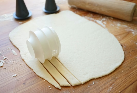 2. Den Teig auf eine bemehlte Arbeitsfläche geben. Teig und Hände bemehlen, die Luftbläschen aus dem Teig drücken, dann mit einer Teigrolle etwa 3mm dünn ausrollen. Den Teig mit dem Teigrad in Streifen schneiden. Die Formen dünn mit Öl bespinseln. Teigstreifen um die 4 Formen wickeln, andrücken und auf ein mit Backpapier ausgelegtes Backblech stellen. Bei 230 Grad (Ober- und Unterhitze, auf mittlerer Schiene) etwa 10 Minuten backen.