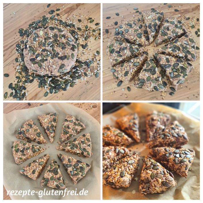 4. Die Saaten auf die Arbeitsfläche geben, dann den Teig auf die Saaten geben. Nun einige Saaten auf den Teig geben und den Teig mit den Händen rund formen. Den Teigling mit einer Teigkarte in 8 Stücke teilen und jedes Teigstück gut mit den Saaten ummanteln.