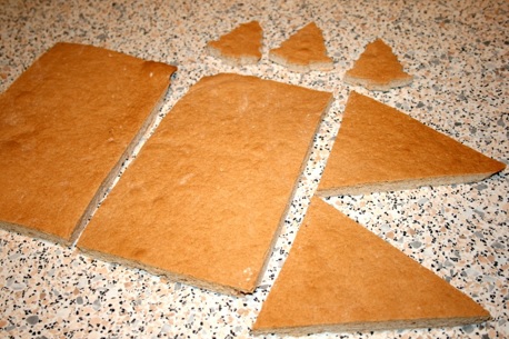 6. Platten zuschneiden. Zwei Rechtecke mit jeweils etwa 10 x 15 cm und zwei gleiche Dreiecke mit etwa 13 cm Höhe und mit je 15 cm Seitenlänge. Aus einem der Dreiecke eine kleine Tür herausschneiden. Aus den Reststücken Tannenbäume ausstechen.