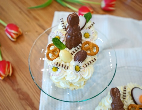 Mini-Schokohäschen, Schokoladeneier, glutenfreie Brezeln, Fondant-Eier, Zebraröllchen, Minze, Gänseblümchen. Bitte darauf achten, dass alle Deko-Produkte glutenfrei sind!