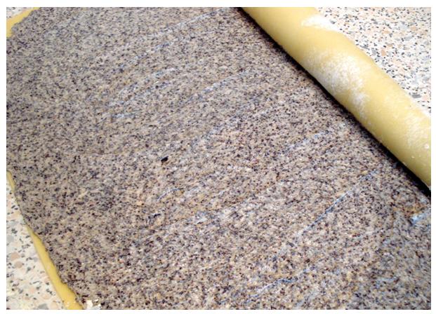 3. Den Teig auf eine bemehlte Arbeitsfläche geben und mit bemehlten Händen kurz kneten. Wichtig ist hierbei, dass nicht übermäßig viel Mehl unter den Teig geknetet wird! Sonst wird der Teig zu fest und das Endprodukt trockener. Den Teig auf der bemehlten Arbeitsfläche etwa 4mm dick, zu einem Rechteck ausrollen.