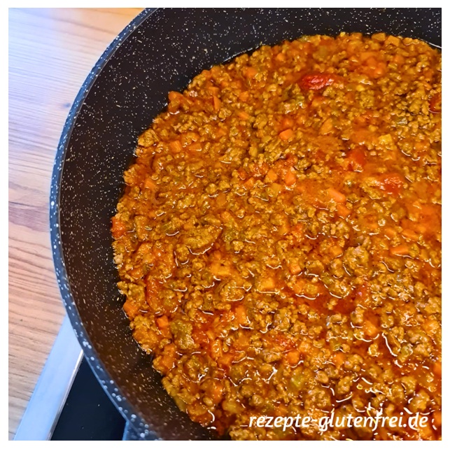 3. Unterdessen das Hackfleisch in einer weiteren, großen Pfanne scharf anbraten. Weißwein und Milch zugeben und aufkochen lassen. Dann die Tomaten zugeben und nochmals aufkochen lassen. Anschließend das gedünstete Gemüse, Knoblauch und Chilischoten zugeben und mit Salz und Pfeffer würzen. Nun sollte die Bolognese 2 – 5 Stunden köcheln, bei Bedarf etwas Brühe aufgießen.