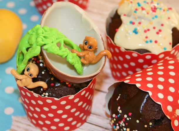 3. Die dunkle Kuvertüre aus der RUF Backmischung erwärmen. 6 Muffins mit der dunklen Kuvertüre bepinseln, mit Zuckerperlen bestreuen und je einer Ü-Ei-Hälfte belegen. Die weiße Kuvertüre schmelzen und mit den restlichen Muffins ebenso verfahren. Nach Wunsch mit den Spielzeugen dekorieren. Kuvertüre trocknen lassen und die Muffins servieren.