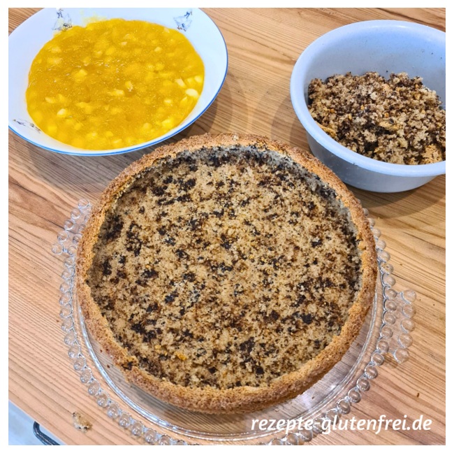 6. Den fertigen Kuchen aus dem Ofen nehmen und vollständig in der Form auskühlen lassen. Anschließend aus der Form lösen und das Backpapier abziehen. Den Kuchenboden auf eine Tortenplatte legen und den Kuchen mit einem Esslöffel etwa ein Drittel von oben aushöhlen, dabei einen Rand stehen lassen. Die Kuchenstücke fein zerbröseln und beiseitestellen.